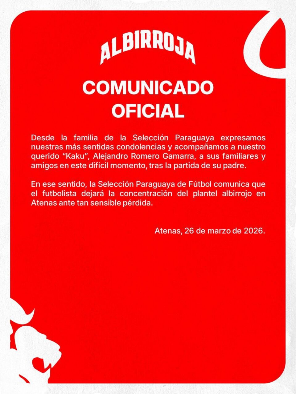 «Desde la familia de la Selección Paraguaya expresamos nuestras más sentidas condolencias y acompañamos a nuestro querido «Kaku», Alejandro Romero Gamarra, a sus familiares y amigos en este difícil momento, tras la pérdida de su padre», expresó el comunicado.