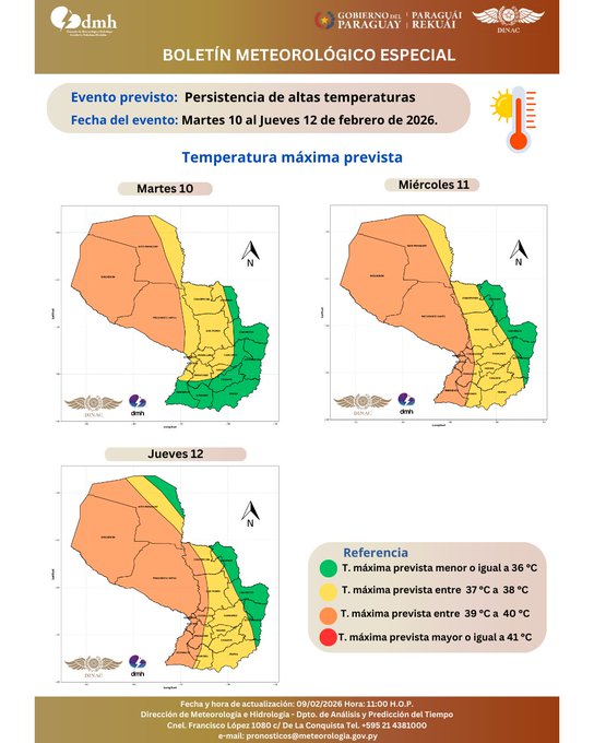 La Dirección de Meteorología e Hidrología emitió una alerta sobre altas temperaturas que persistirán por el resto de la semana, con máximas que superarían los 40 °C en algunos puntos del país.