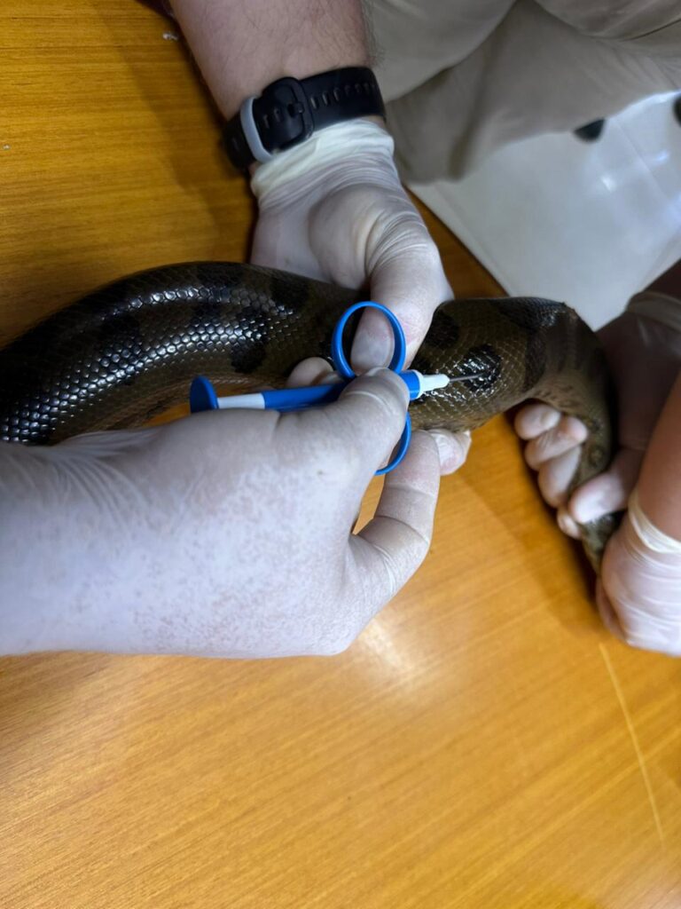 Colocan microchips para monitorear la población del mbói jagua. Foto: Gentileza