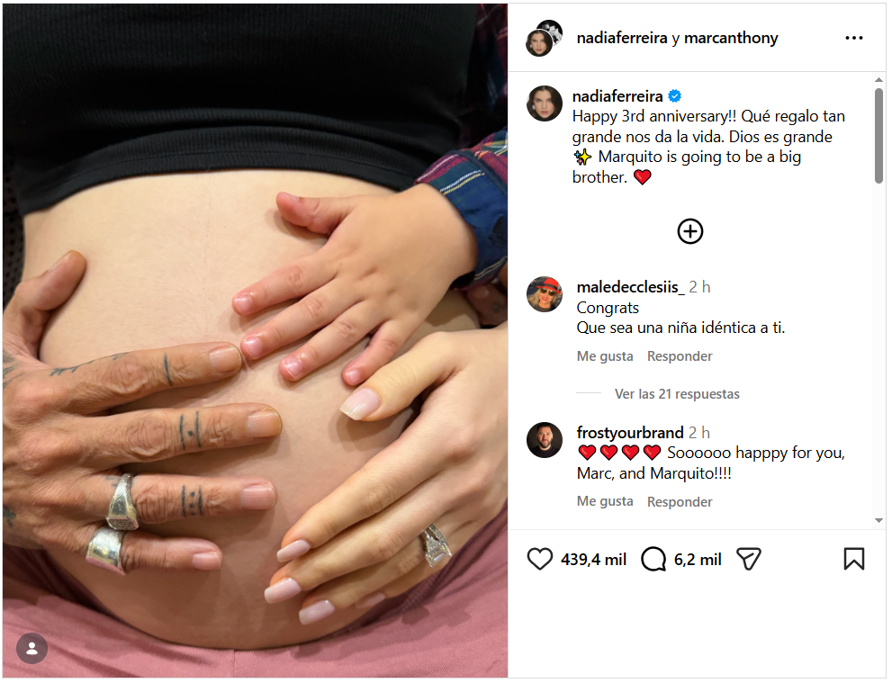 La pareja posteó una tierna fotografía en donde dejan al descubierto la pancita de Nadia, mientras su mano, la de Marc y la de su pequeño hijo Marco la tocan.